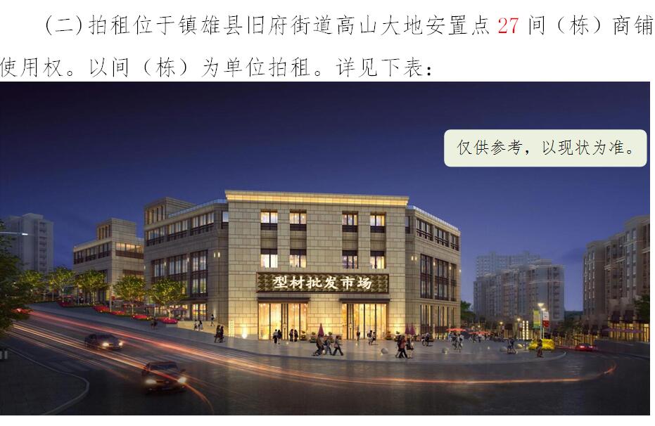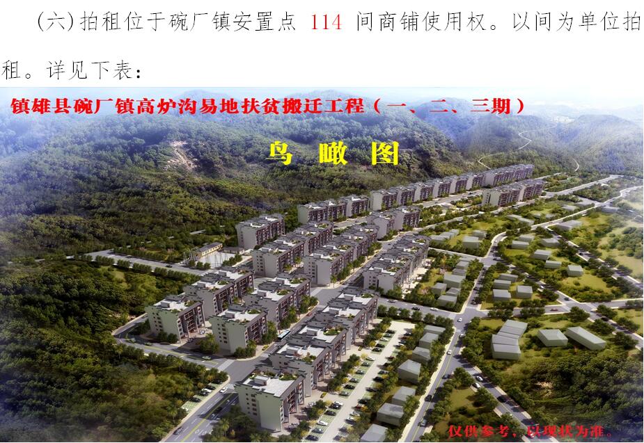 經(jīng)鎮(zhèn)雄縣人民政府批準(zhǔn),受相關(guān)部門(政府)委托,公開(kāi)拍租位于鎮(zhèn)雄縣易地扶貧搬遷工程呢嚕坪安置點(diǎn)7棟獨(dú)立商鋪使用權(quán)、高山大地安置點(diǎn)27間(棟)商鋪使用權(quán)、魯家院子安置點(diǎn)24間(棟)商鋪使用權(quán)、母享安置點(diǎn)146間商鋪使用權(quán)、以勒物流城安置點(diǎn)67間(棟)商鋪使用權(quán)、碗廠安置點(diǎn)114間商鋪使用權(quán)。相關(guān)事項(xiàng)如下: