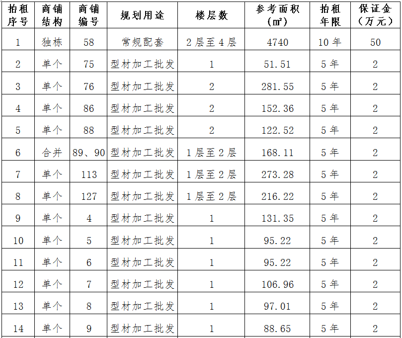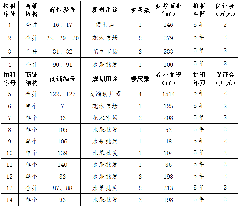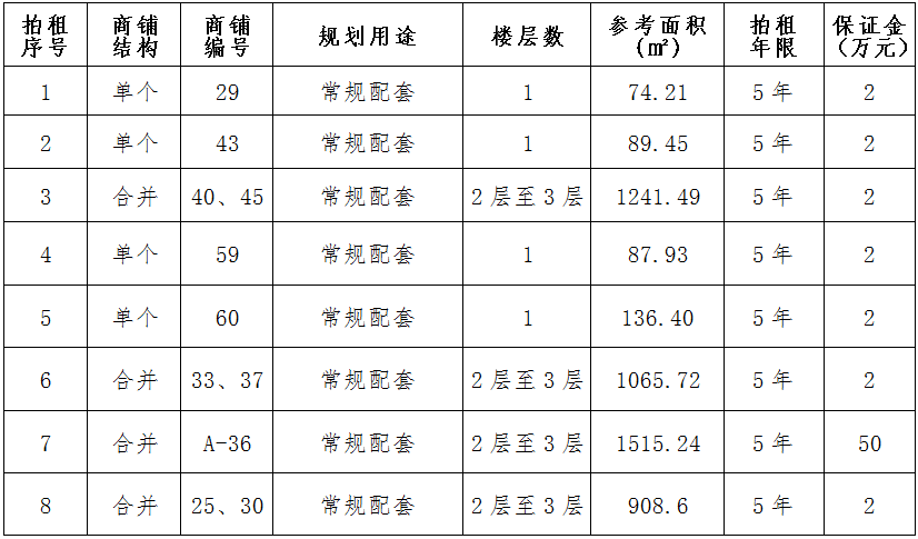 (一)拍租位于鎮(zhèn)雄縣南臺(tái)街道呢嚕坪安置點(diǎn)8間商鋪使用權(quán)。以間為單位拍租。詳見(jiàn)下表: